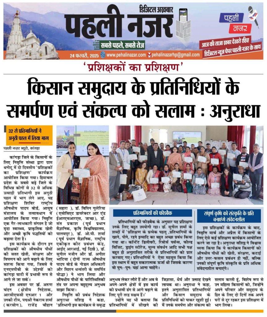 प्राकृतिक खेती, जड़ी बूटी उत्पादन के लिए श्रद्धा सुमन की निवृत्ति संस्था जिला कांगड़ा तहसील…